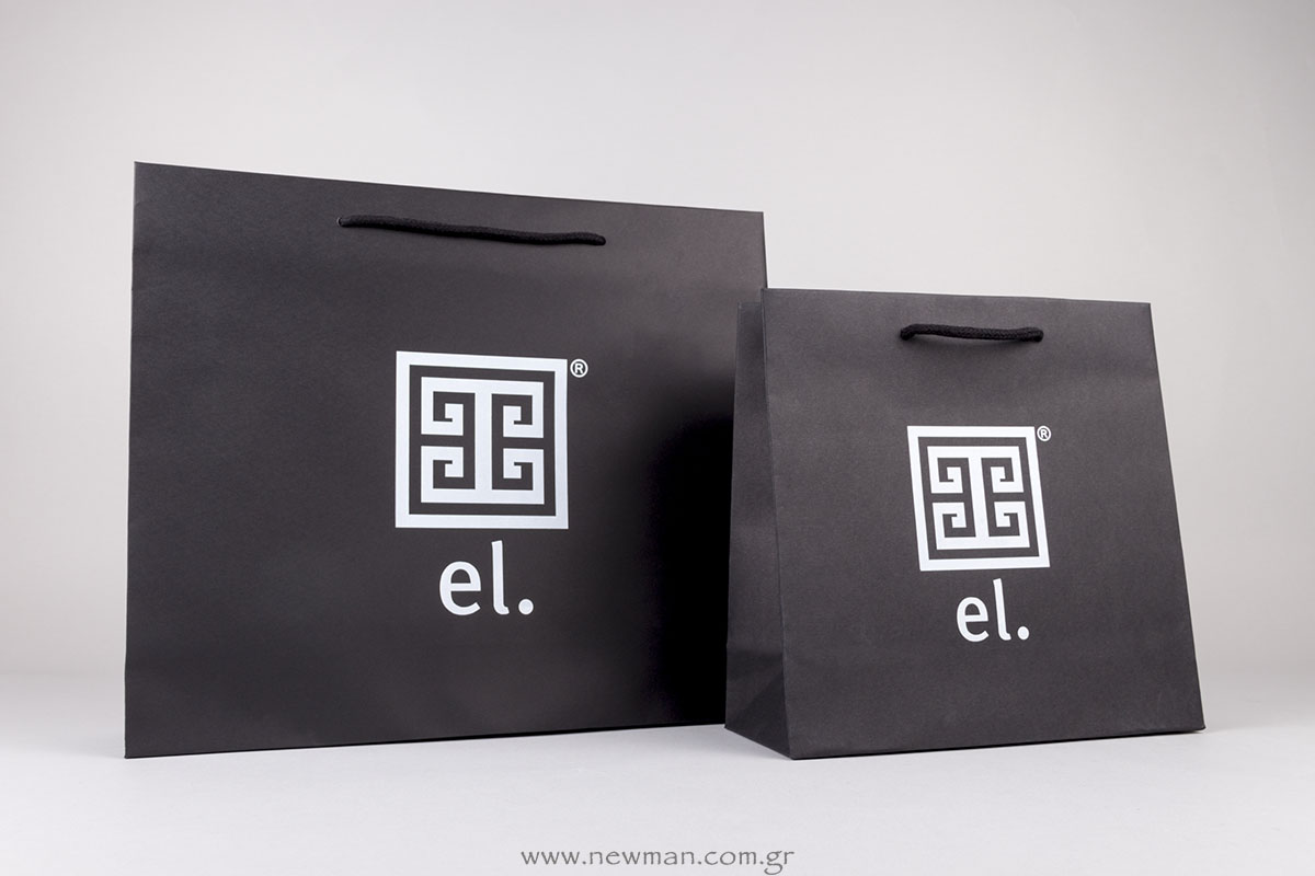 Λευκή εκτύπωση μεταξοτυπίας σε μαύρη χάρτινη τσάντα για το κατάστημα el.